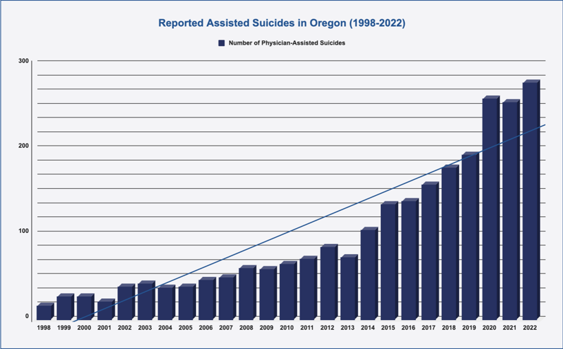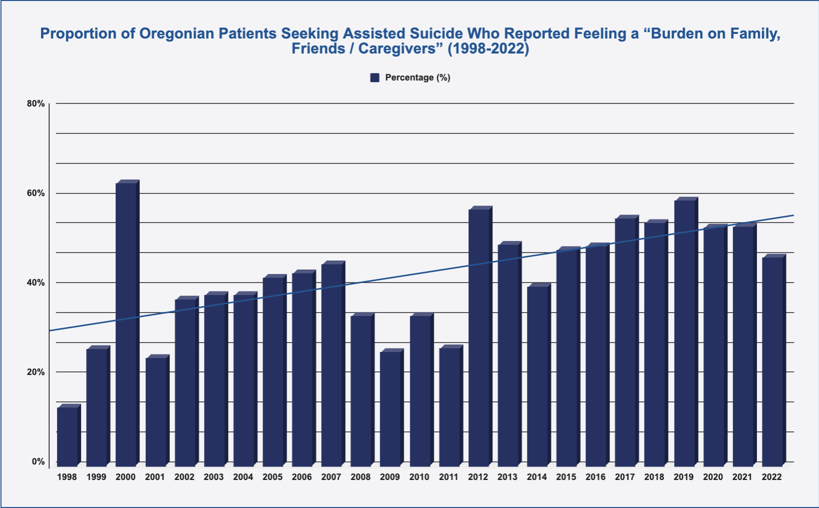 - The proportion of patients reporting that they opted for assisted suicide because they feel a burden on family, friends, and other caregivers has risen from 13% in 1998 to 46.4% in 2022, indicating a dark turn in social attitudes brought about by assisted suicide in that State.