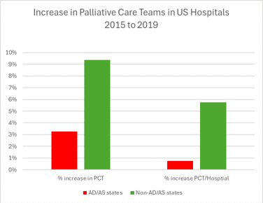 - Between 2015 and 2019 palliative care teams in hospitals increased by 3.2% in U.S. States with AD / AS while non-AD / AS States saw an increase of 9.4%.